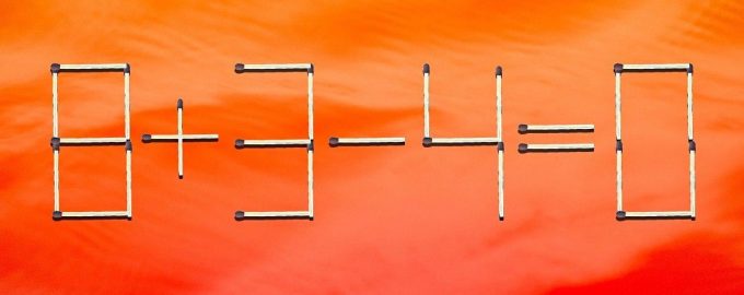 Evo primjera 8+3-4=0, koji je očito netočan. Morate pomaknuti samo jednu šibicu kako bi zadatak imao smisla. Prema pravilima takvih zagonetki, ne možete ukloniti štapiće sa znaka “=” ili ga prekrižiti, ali možete promijeniti sve druge simbole i brojeve.
