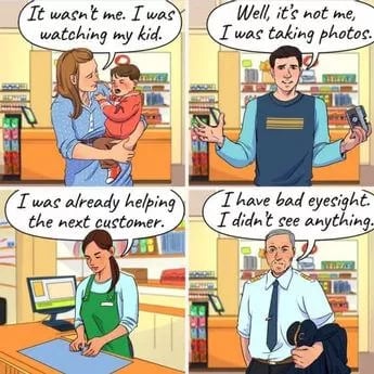 Na gornjoj slici četiri osobe, a samo jedna od njih laže o svom alibiju. Najprije majka s djetetom kaže da nije mogla uzeti novčanik jer je “gledala dijete”, a muškarac s kamerom tvrdi da to nije on jer je “fotkao”.