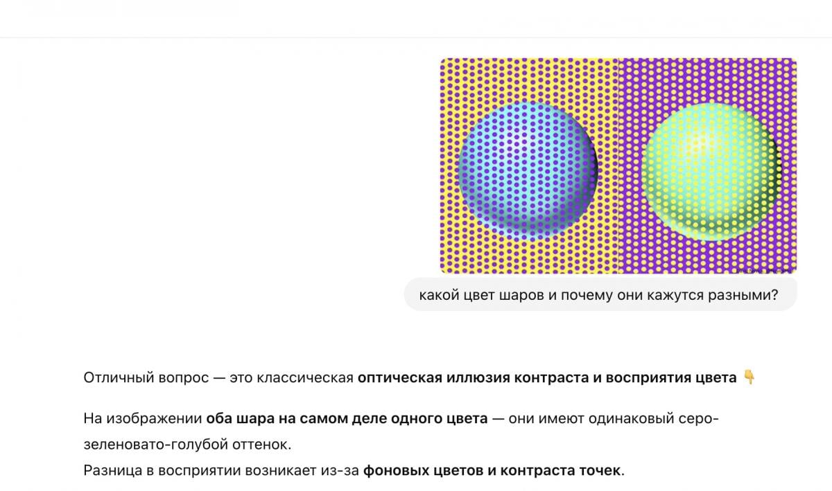 Umjetna inteligencija objašnjava da se u ovom slučaju optička iluzija stvara pomoću efekta kontrasta koji uzrokuje da naš mozak različito percipira boju kuglica ovisno o boji okolnih točkica.