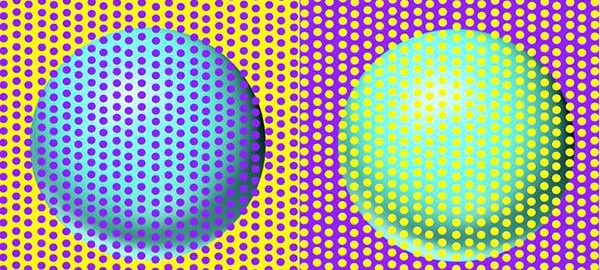 Kuglice izgledaju drugačije jer je lijeva kuglica okružena ljubičastim točkicama na žutoj pozadini, dok je desna kuglica okružena žutim točkicama na ljubičastoj pozadini.