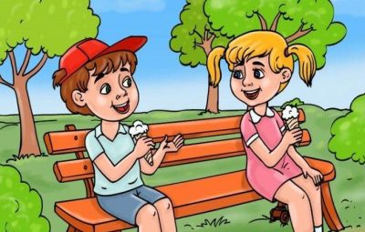 Na slici vidimo dječaka i djevojčicu kako sjede na klupi u parku i jedu sladoled. U pozadini se vide stabla s velikim zelenim krošnjama. Vremenski uvjeti prikazani na slici sugeriraju da se radnja odvija ljeti.