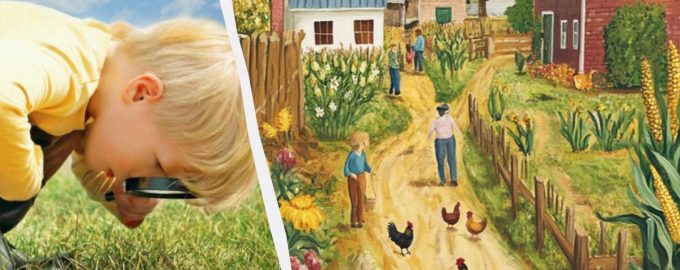 Na primjer, pokušajte shvatiti što nije u redu na crtežu vrta u kojem mlada žena radi. Ili potražite nedostatak na slici slikovite ulice koji nije odmah uočljiv.