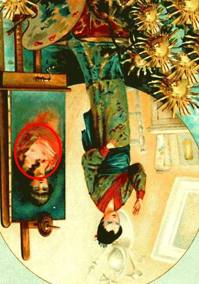 Na slici vidimo ženu koja stoji blizu portreta. Na prvi pogled može se činiti da su na slici samo dva lica – žena koja stoji i muškarac na portretu. Ali nije to tako jednostavno. Umjetnikovo lice zapravo je negdje skriveno, što nije tako lako primijetiti.