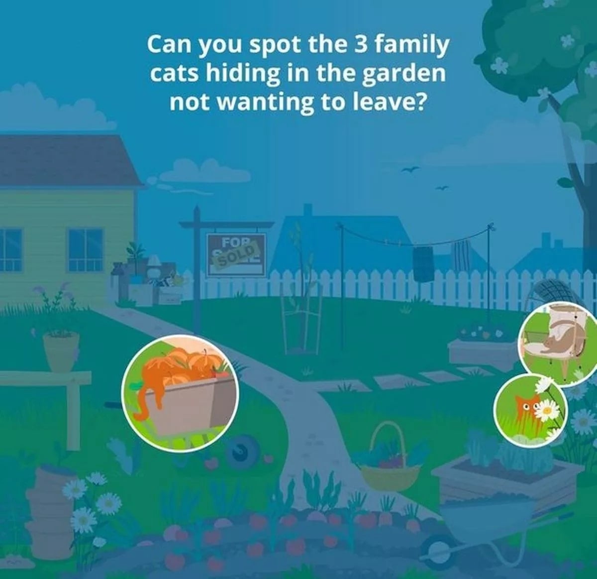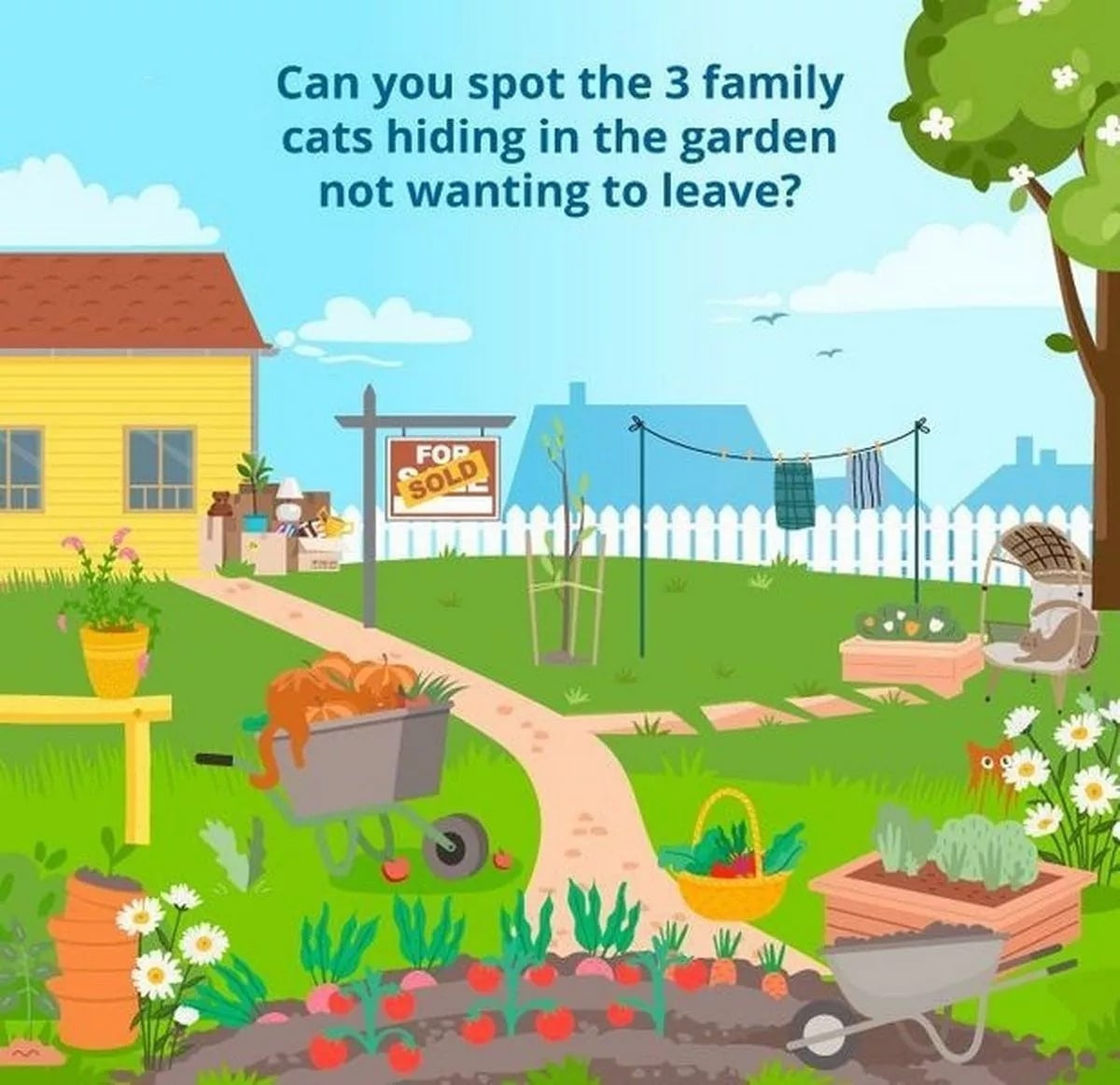 Dakle, pažljivo pogledajte sliku. U ovoj posebno kaotičnoj slagalici pronaći ćete ne jednu, ne dvije, već tri mačke koje se skrivaju u svom omiljenom skrovištu – vrtu.