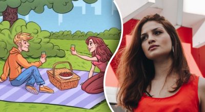 Na slici vidimo momka i djevojku koji su došli u slikovito mjesto na piknik. Sjede na pokrivaču položenom na travu i drže čaše s pićem u rukama. A iza njih možete vidjeti tipa kako se igra s dva psa.