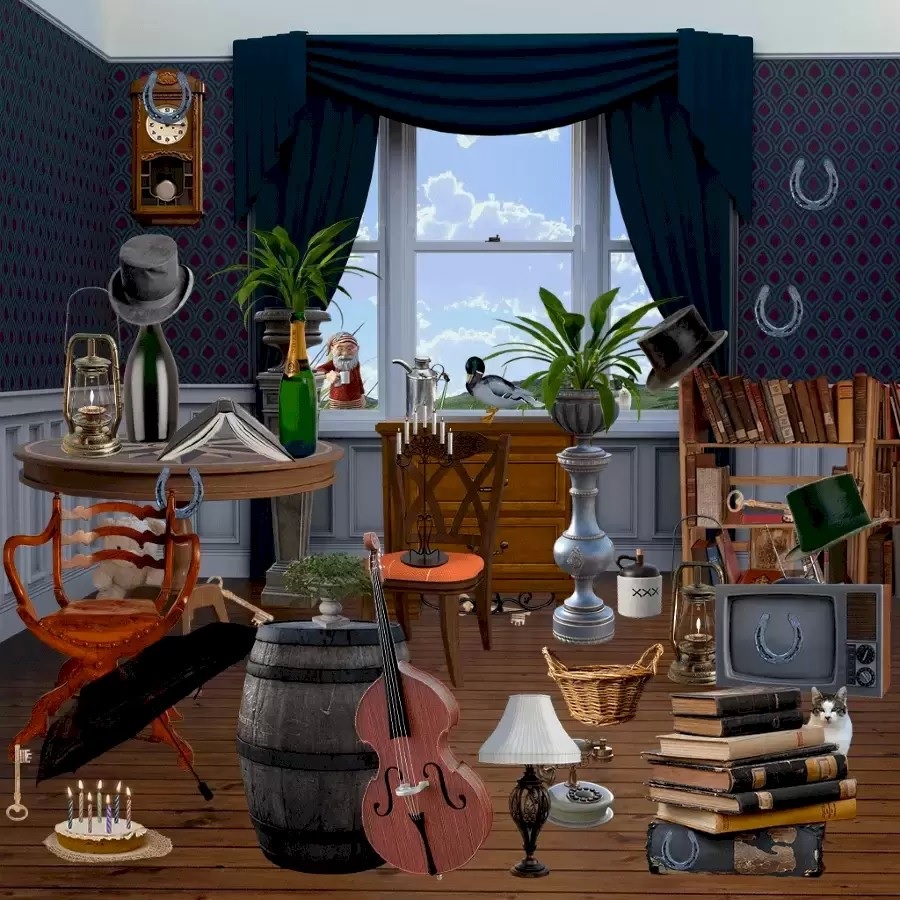 Na slici vidimo sobu u kući pretrpanu mnogim stvarima, od knjiga, lampi i namještaja do violine, drvene bačve pa čak i rođendanske torte. Takvo gomilanje stvari, koje je čak i čudno vidjeti sve zajedno u jednoj prostoriji, namjerno zbunjuje gledatelja kako bi ga spriječilo da se koncentrira na glavni zadatak – pronalaženje mačaka.