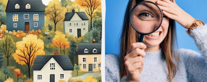Ispod ćete vidjeti sliku stambenog područja s udobnim kućama i šarenim drvećem. Vaš zadatak je pronaći rode među ovom ljepotom.