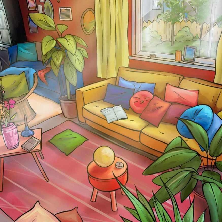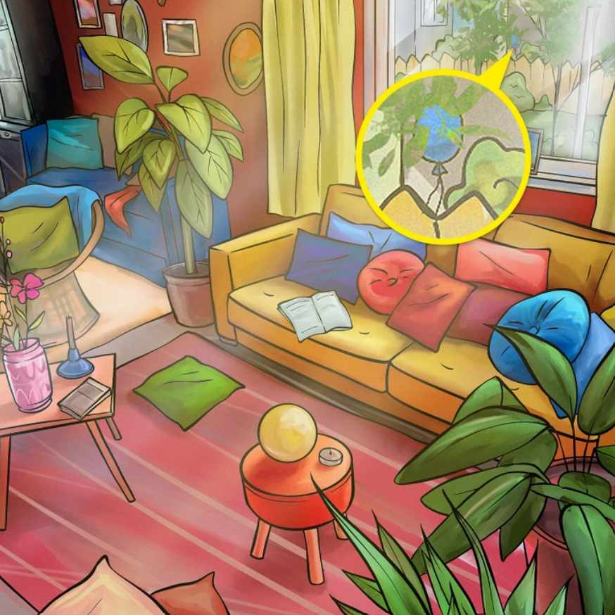 Na gornjoj slici možete vidjeti unutrašnjost dnevne sobe. Ispred velikog prozora koji gleda na vrt nalazi se kauč, lončanice, stolovi i nekoliko jastuka različitih oblika. Negdje na ovoj slici je skriven balon. Možete li je pronaći? U ovoj slagalici morate pronaći balon u određenom vremenskom razdoblju.