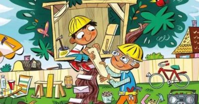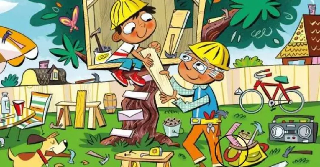 Na slici su djed i unuk koji prave kućicu na drvetu. Prikazani su i magnetofon, bicikl, stol, kuće, pa čak i slova. Moramo pronaći magnet.