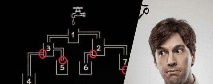 Na prvi pogled se čini da će se posuda 4 prva napuniti, jer se nalazi na dnu. Ali ako bolje pogledate, vidjet ćete da cijev koja spaja posudu 3 i posudu 4 nema rupu, što znači da voda ne može teći kroz nju. Cijevi između nekih zdjela su otvorene za vodu, a postoji i zdjela s rupom. Dakle, posuda 3 će se prvo napuniti. Ali zdjela 2 nikada neće biti puna, jer ispod nje postoji zdjela 7, koja je puna rupa.