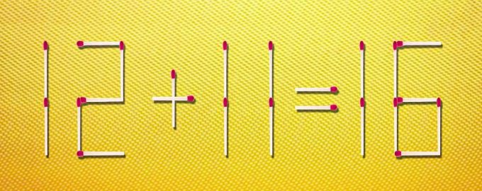 Slika prikazuje netočnu matematičku jednadžbu 12 + 11 = 16. Sastoji se od 23 šibice. Jedan od njih postavljen je na krivo mjesto. Ako ga premjestite na drugo mjesto, jednakost će postati ispravna. Vaš zadatak je pogoditi koju šibicu treba premjestiti i kamo.